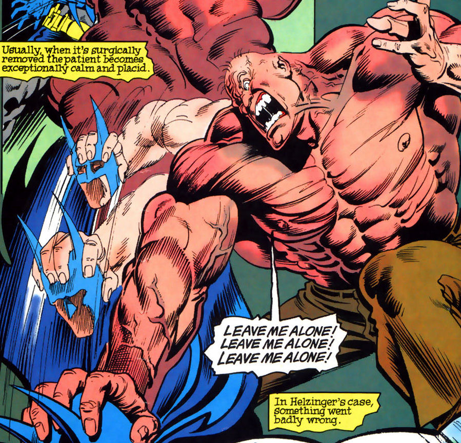A short time later, the super-villain known as Bane orchestrated a massive breakout at Arkham Asylum and all of the patients, including Amygdala were freed. Amygdala found himself befriending Arnold Wesker, aka, the Ventriloquist who decided to take advantage of the brute's strength. In exchange for helping him find the misplaced dummy, Scarface, the Ventriloquist promised Helzinger that he would help him find his meds. Armed with a surrogate dummy known as "Socko" (which was just a discarded sweat sock), the Ventriloquist and Amygdala visited the Tap Room bar in the hopes of finding Scarface. The bar patrons laughed at the Ventriloquist, not realizing that Amygdala was ready to defend him. Seeing the Ventriloquist being mocked and laughed at drove Amygdala into a frenzy and he went berserk, brutalizing nearly everyone in the bar. Once he calmed down, Amygdala immediately regretted his violent outburst and was desperate to earn the Ventriloquist and Socko's approval.