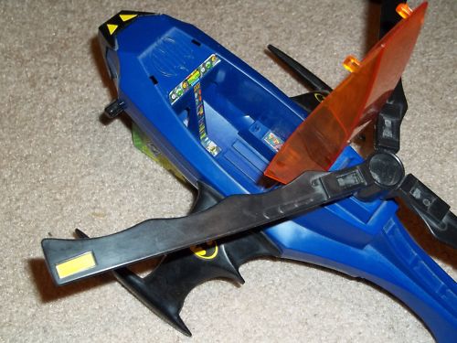 Features firing nose cone with winch, spinning rotors, and villain trap on bottom. Villain trap can old a figure by an arm and spins with the rotors. Seats one figure. Later reissued in all black for Kenner's The Dark Knight Collection.