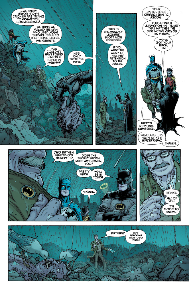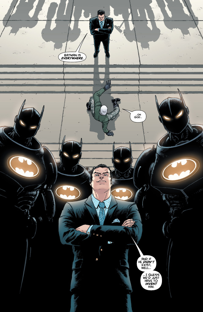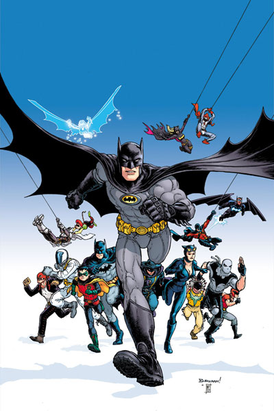Cover: J. H. Williams III Characters: Batman (Bruce Wayne) ; Batman (Dick Grayson); Robin (Damian Wayne); Red Robin (Tim Drake); Batgirl (Stephanie Brown); Blackbat (Cassandra Cain); Batwing (David Zavimbi); Dark Ranger; Huntress (Helena Bertinelli); Nightrunner; Oracle (Barbara Gordon); Freight Train; Halo; Katana; Looker; Metamorpho; Alfred Pennyworth; Commissioner James Gordon;Dr. Dedalus; Leviathan |