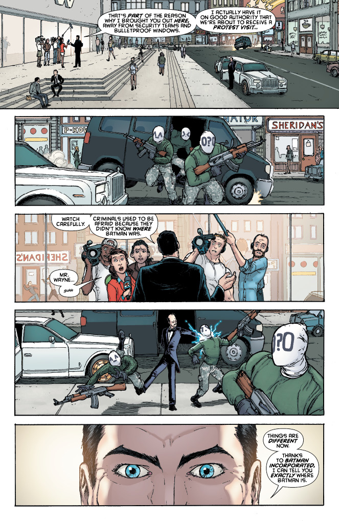 Wayne Enterprises’ latest press conference is interrupted by a strange new gang led by a villain calling himself “Emoticon-Man” – and Red Robin is appointed as the leader of the Batman Inc. stealth team (better known as The Outsiders) in the next chapter of Grant Morrison’s globe-spanning Batman epic.