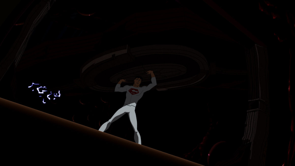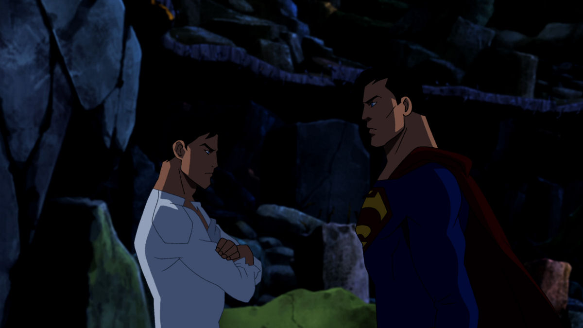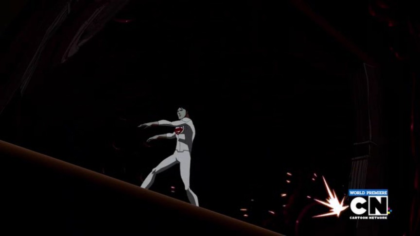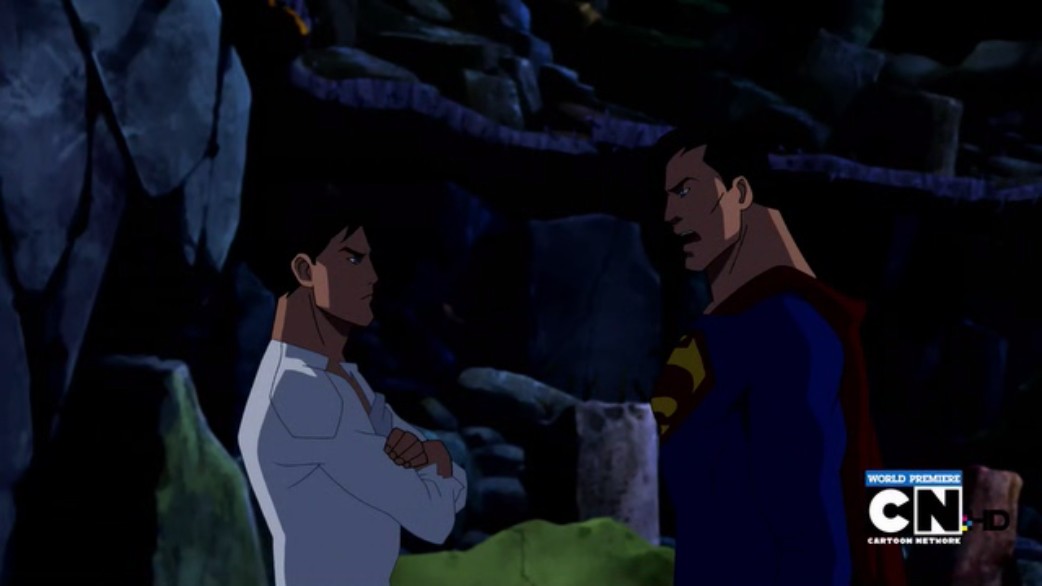 Superboy protects his comrades, and the others show him the sky for the first time. Superman flies down with the rest of the League. Superboy steps forward and announces what he is, and Superman stares suspiciously at him. Batman demands explanations.