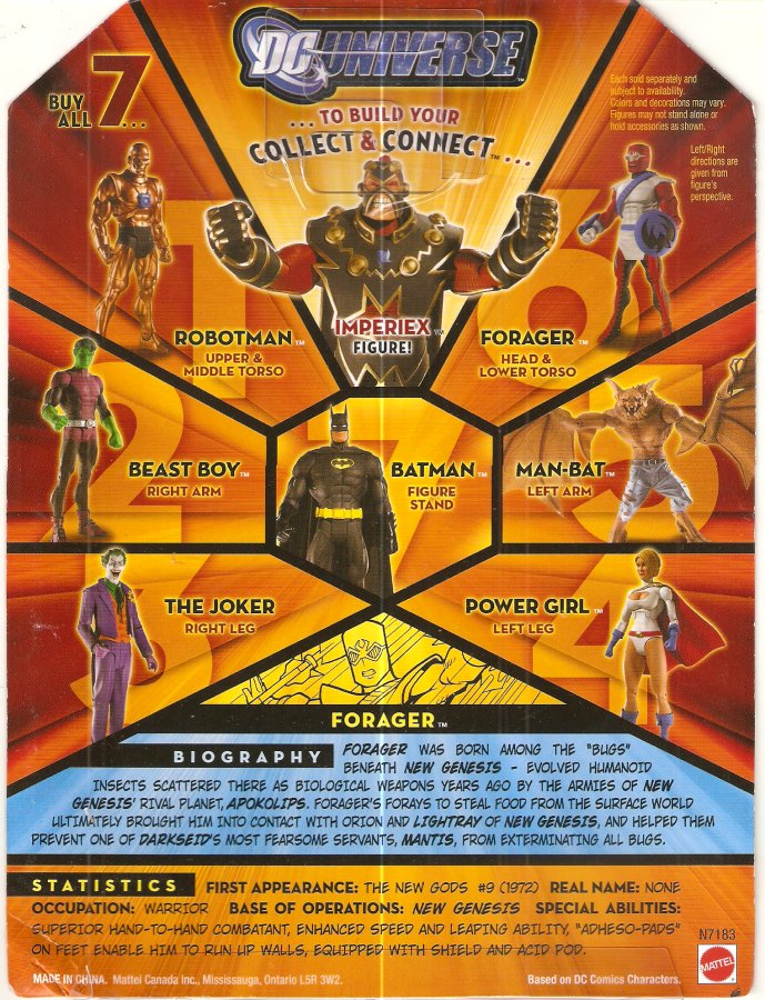 Forager was born among the "Bugs" beneath New Genesis - evolved humanoid insects scattered there as biological weapons years ago by the armies of New Genesis' rival planet, Apokolips. Forager's forays to steal food from the surface world ultimately brought him into contact with Orion and Lightray of New Genesis, and helped them prevent one of Darkseid's most fearsome servants, Mantis, from exterminating all Bugs.