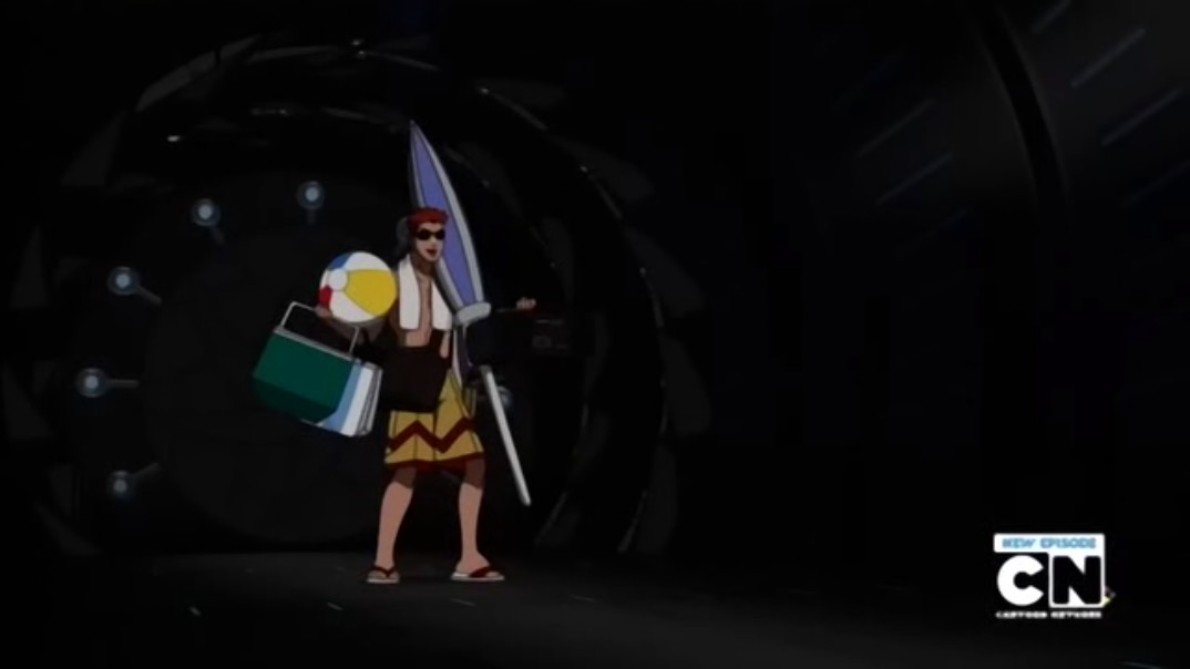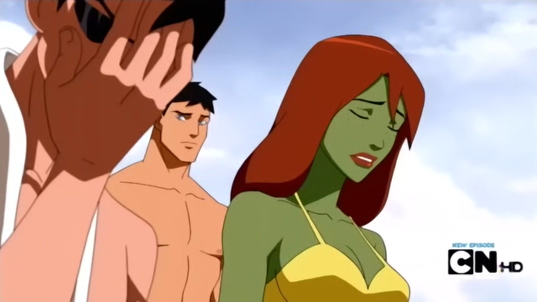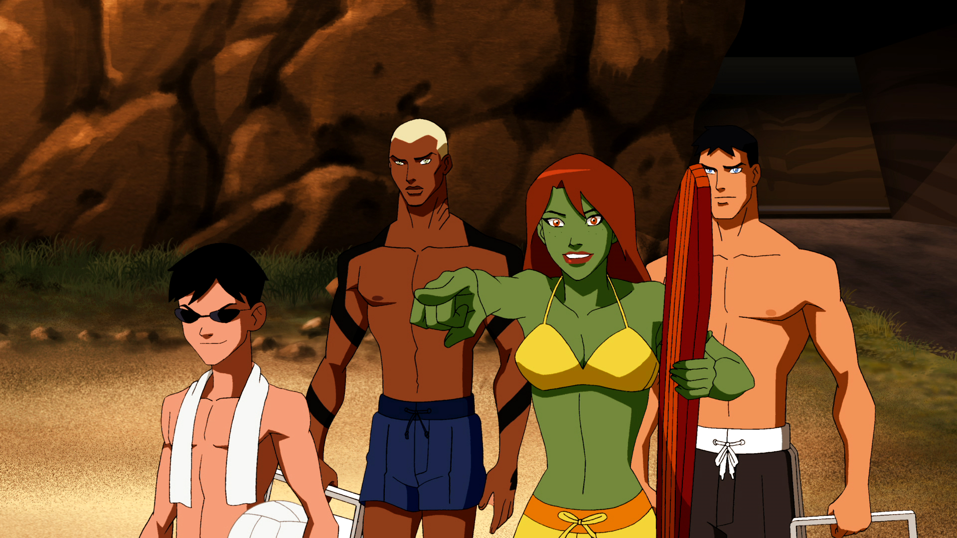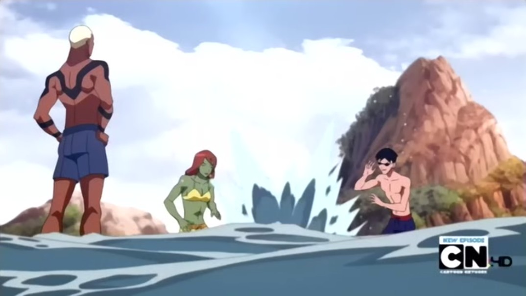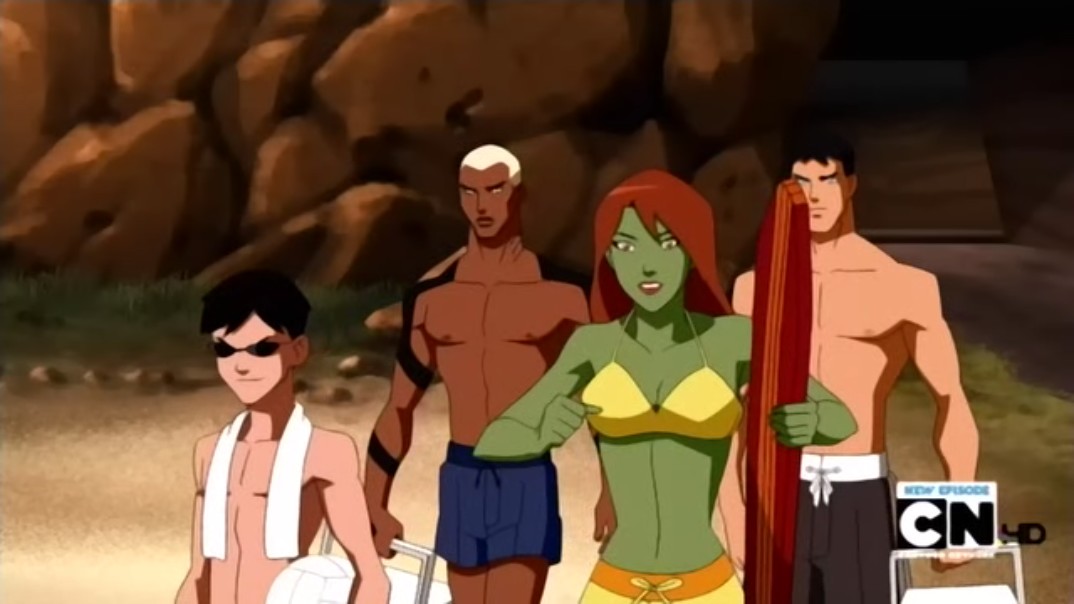 At Mount Justice, the team goes out on the beach. They mourn their absent comrade... Wally, who has to go to class for the first day. They enjoy themselves