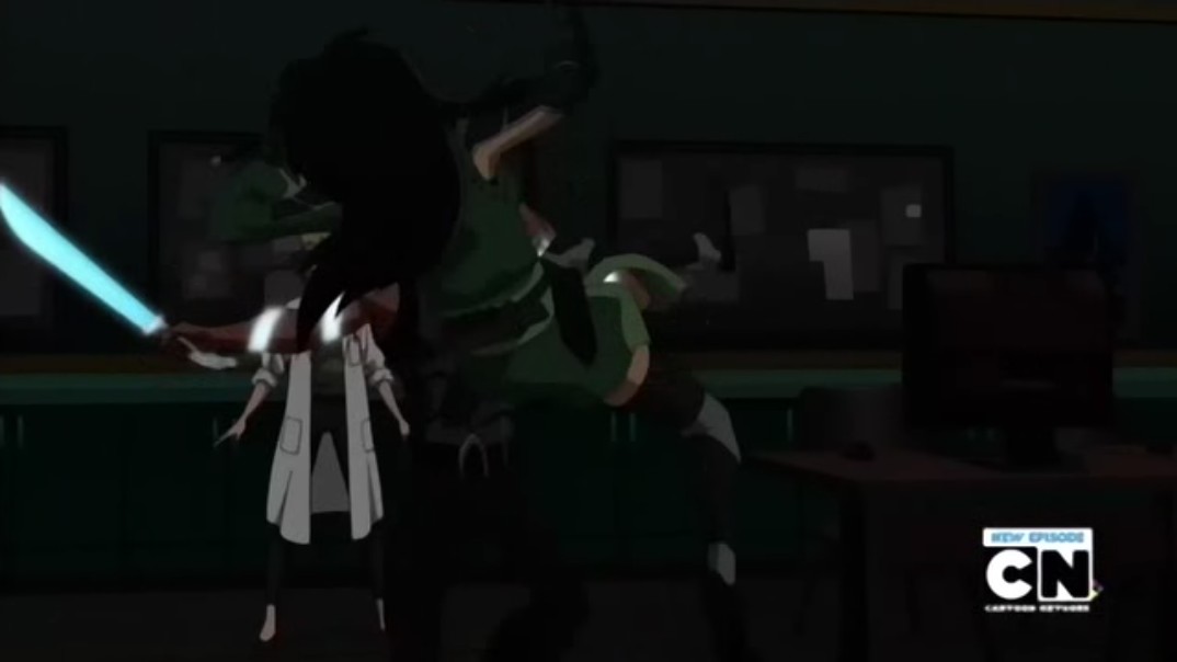 Inside, Kid Flash hears someone moving and runs into the pool to check them out. He trips on ball bearings and the intruder knocks him out. She then goes into the lab and throws a poisoned shuriken at Serling. Aqualad takes it, and it seemingly fails to penetrate his skin. The intruder, Cheshire, attacks him and points out that the poison is slowing him down. Cheshire throws one of her sai at him, but Artemis arrives and deflects it.