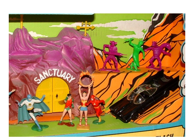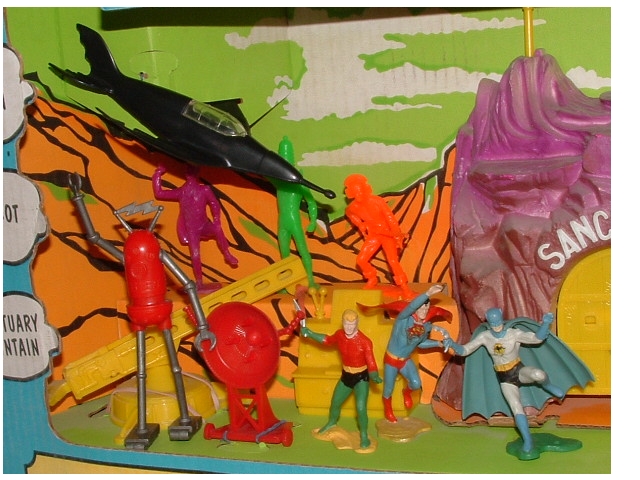 Batman & The JLA Playset Features Batman, Robin, Superman, Wonder Woman, Aquaman, Flash, Plus the Joker, Kaltor, Brainstorm, Thunderbolt, Keyman, Mouseman, Santuary Mountian, Periscope, Weather Vane Key, Batmobile, Batplane & Launcher, Reflector Ray Weapon, Console, Robot & 5 Other Arch Enemies.Additonal Pics: |