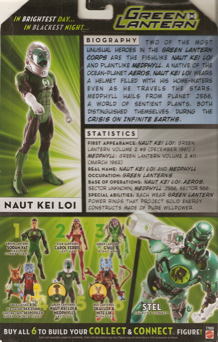 Two of the most unusual heroes in the Green Lantern Corps are the fishlike Naut Kei Loi and the plantlike Nautkeiloi. A native of the ocean-planet Aeros, Naut Kei Loi wears a helmet filled with this home-waters even as he travels the stars. Nautkeiloi hails from planet J586, a world of sentient plants. Both distinguished themselves during the Crisis on Infinite Earths.