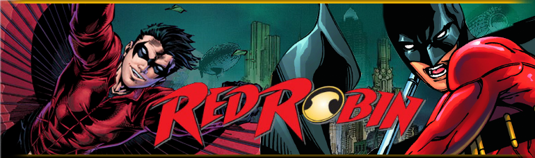 Red Robin is a vigilante superhero associated with the Batman Family, usually a graduated form of Batman's original sidekick Robin. The original Red Robin was Dick Grayson of the Kingdom Come universe, an alternate form of the character's usual Nightwing alias. Jason Todd, also known as Red Hood at the time, became the first regular Red Robin of the mainstream DC Universe when he received the costume as a gift from the Batman of an alternate universe during Countdown. After Todd stopped using the costume it came into the possession of a super-villain named Ulysses Armstrong who wore it briefly. Tim Drake took the mantle at the end of Battle for the Cowl after his position as Robin was given to Damian Wayne. He uses it to assume a darker persona following the death of his mentor and father-figure Bruce Wayne during Final Crisis. Red Robin was created by Mark Waid and Alex Ross, originally appearing as an Elseworlds character in Kingdom Come #2. (1996) The costume's first appearance in regular continuity was in Countdown to Final Crisis #14. (2008)