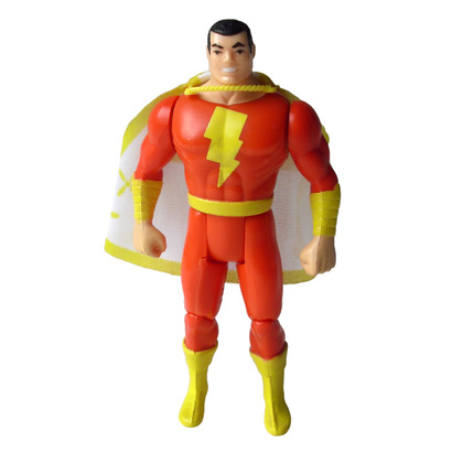 Includes a removable cloth cape. Features punching arms activated by squeezing the legs together. This figure was marketed as "Shazam!" rather than "Captain Marvel" due to legal issues.