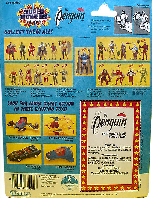 Includes a Super Powers Collection mini comic and umbrella accessory. Umbrella features a spinning top and a retractable rod. Features a swinging arm activated by squeezing the legs together. Coat tails are removable. The sculpt was reused later for other Penguin figures from Toy Biz and Kenner.
