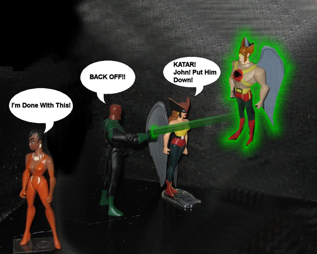 Later that year, they ascertained that the villainous Shadow Thief was actually Hawkman's inner desires brought to life by the Absorbacron. Hawkman, John Stewart and Hawkgirl are forced to experience the memories of Shayera and Ashari in ancient Egypt. Hawkman then learned that he is not destined to have Shayera; instead, he believes that she is destined to be with John Stewart.