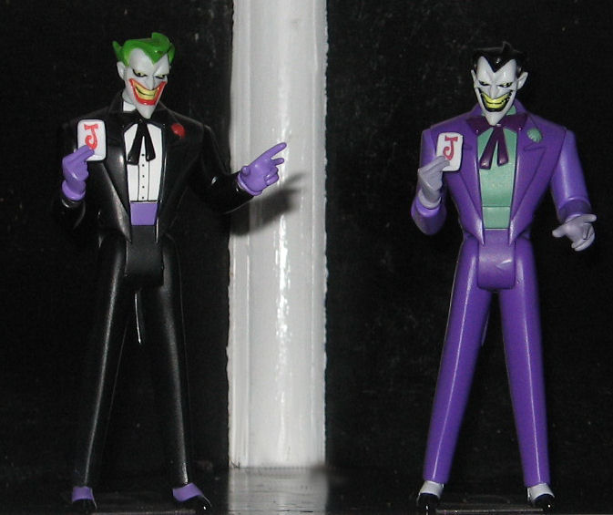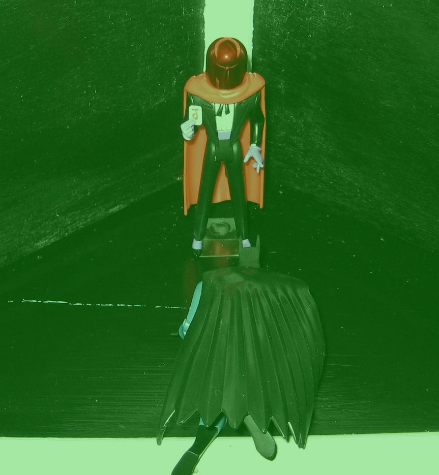 The Red Hood never actually appeared in the animated universe. But the story goes that the man later known as the Joker was a master criminal going by the alias of the Red Hood. His costume consisted of a large domed red helmet and a red cape. While attempting to rob a chemical plant, his men were dispatched and then he was suddenly surrounded on a catwalk by Batman and Robin. Left with no alternatives, he dove into a catch basin for the chemicals and swam to freedom, surviving because of a special breathing apparatus built into the helmet. The toxins in the vat permanently and grotesquely disfigured him, turning his hair green, his skin white and his lips red. Upon discovering this, he went insane and became the Joker.