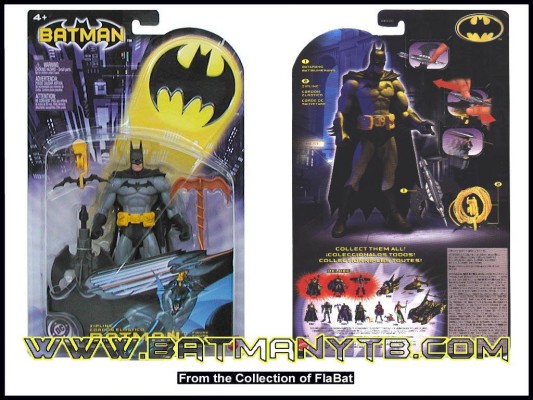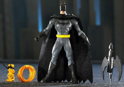 The figure stands 6.5 inches tall (to the ear tips) and has 12 points of articulation (head, shoulders, gloves, waist, hips, and knees) and a cloth cape. It comes with a Zipline and a Batarang Launcher that fires a projectile that snaps on his arm.