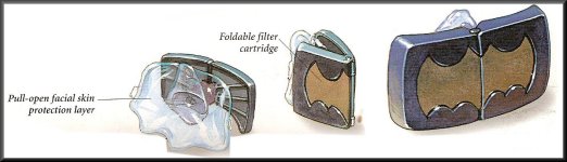 In addition to compact conventional gas masks stored in six-pack Utility Belt magazines, Batman carries a more durable gas mask with positive-seal integral mouthpeice. This mask is designed for "full-spectrum" deployment, able to protect against a wide variety of nuclear, biological, and chemical agents.