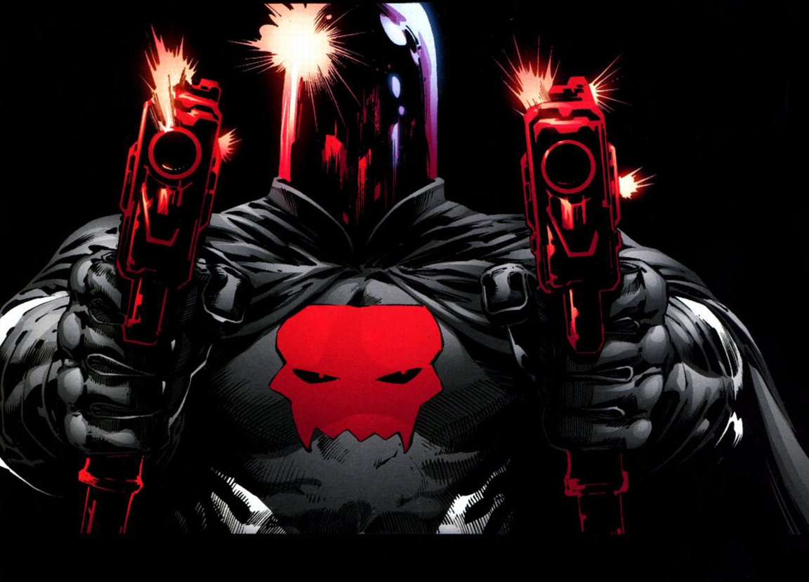 With his new partner, Jason resumed his brutal and lethal methods of dealing with criminals, but now there was a twist. Using the media and internet, he exposed his methods to the public and actively marketed them as the way should be done. Public opinion was actually at least somewhat in his favor, especially after he showed Batman and Robin protecting the Penguin from him and Scarlet. He was able to keep ahead of Batman and Robin, getting to criminals first and evading their attempts to apprehend him. That lasted until he tracked down a criminal who got away from him to finish what he had started. Batman and Robin arrived to stop them, and the two duos fought. The fight went in Jason's favor. Instead of the two heroes capturing him, he captured them and locked them out of his way for the time being. It was then that Jason and Scarlet were ambushed by an assassin called Flamingo. He took two shots from a sniper's rifle, shattering his helmet.