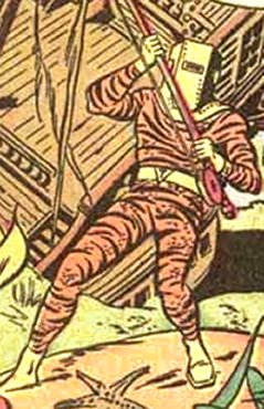Dr. Gaige was a famed oceanographer known for his many discoveries in the field. Boredom and greed eventually drove Gaige to crime. Donning a striped orange diving costume complete with a helmet and tiger stripes, Gaige adopted a secret identity as the Tiger Shark. Recruiting a dockside gang of criminals to do his bidding, Tiger Shark led his gang of thugs to an undersea headquarters in a sunken ship 200 miles from shore. The Tiger Shark, a brilliant criminal mastermind, plotted a series of spectacular crimes at sea and on the waterfront, which he promptly executed, unopposed, with his henchmen.