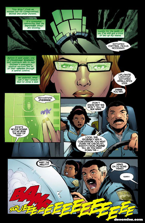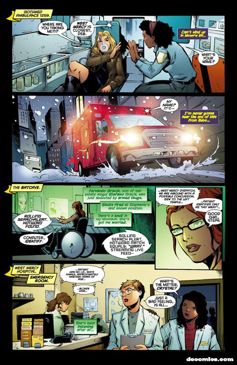 CHARACTERS: Batgirl (Stephanie Brown); Oracle (Barbara Gordon); Batman (Dick Grayson); Robin (Damian Wayne); Commissioner James Gordon; Alfred Pennyworth; Detective Nick Gage; Diesel; Francisco Gracia; Stefano Gracia; Jordanna Spence