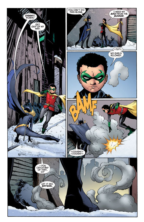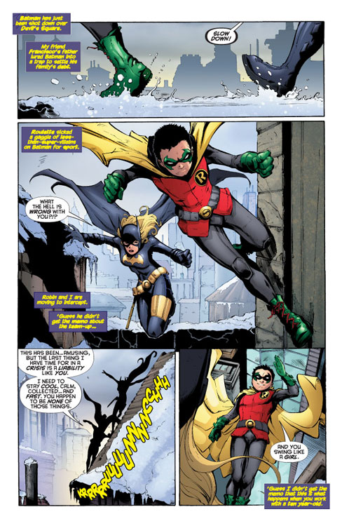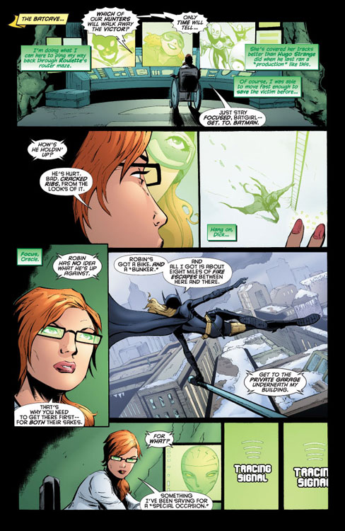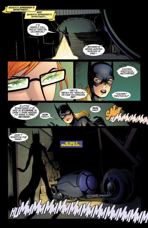 CHARACTERS: Batgirl (Stephanie Brown); Batman (Dick Grayson); Robin (Damian Wayne); Roulette (Veronica Sinclair); Roxy Rocket (Roxanne Sutton); Dr. Phosphorus (Alex Sartorius); Riot (Frederick von Frankenstein); Detective Nick Gage; Francisco Gracia; Stefano Gracia; Jordanna Spence
