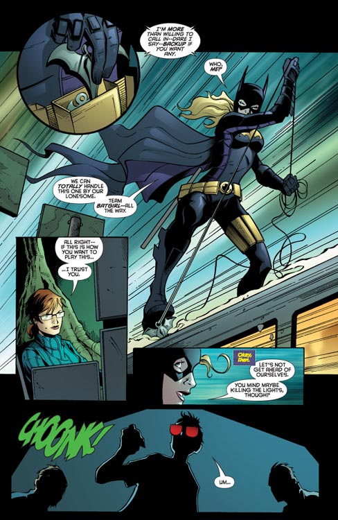 CHARACTERS: Batgirl (Stephanie Brown); Oracle (Barbara Gordon); Commissioner James Gordon; Wendy Harris; Detective Nick Gage; Calculator (Noah Kuttler)