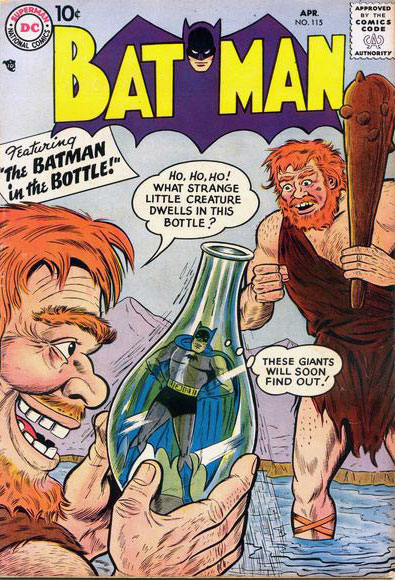Batman constructs a giant bottle and climbs inside. He is found by the giants and claims to be a genie. Using science and tricks, Batman makes the giants believe he possesses magic. Batman bluffs the giants into making peace with the Zotos. When Batman returns to the present, he leaves the bottle with a Batman dummy inside behind to ensure that the giants do not return to menace the people.