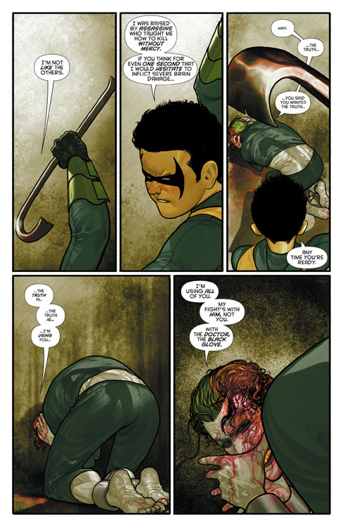 One of our heroes lies near death! Dick Grayson and Damian Wayne enter the ultimate, blood-soaked battle against two foes who almost destroyed the original Batman. Are the new Dynamic Duo up to this final confrontation with absolute evil? If they can’t truly bond as a team, they’re dead!