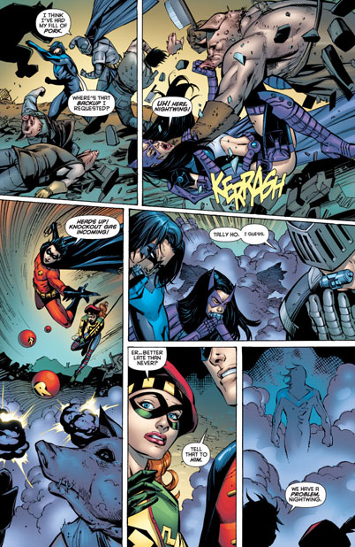 The vehicle rolls over several times before coming to a halt in a murky river bed where Ivy and Croc lie in wait. Before Damien can become Croc's next meal, Nightwing swoops in on his glider and saves the day. He and the boy are en route to the docks when an RPG comes from out of nowhere and knocks the craft off course crashing into an abandoned