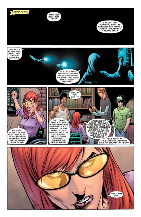 With some quick last minute thinking, Oracle is able to save herself and her friends by racing to the breaker box and cutting power to the place. But her recent