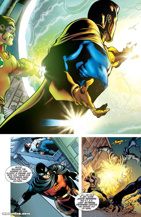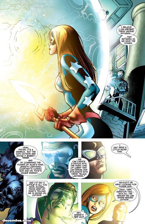 CHARACTERS: Mr. Terrific (Michael Holt); Dr. Mid-Nite (Pieter Cross); Black Lantern Dr. Mid-Nite (Charles McNider); Black Lantern Sandman (Wesley Dodds); Black Lantern Damage (Grant Emerson); Black Lantern Johnny Quick (Johnny Chambers); Black Lantern Lois Lane (Earth-2); Doctor Fate (Kent V. Nelson); Green Lantern (Alan Scott); Stargirl (Courtney Whitmore); Ma Hunkel; Wildcat (Ted Grant); Power Girl (Karen Starr); Hourman (Rick Tyler); Jesse Quick (Jesse Chambers); Atom Smasher (Al Rothstein); Cyclone (Maxine Hunkel); Magog (Lance Corporal David Reid); Wildcat (Tom Bronson); Judomaster (Sonia Sato); Citizen Steel (Nate Heywood); Black Lantern Superman (Earth-2)