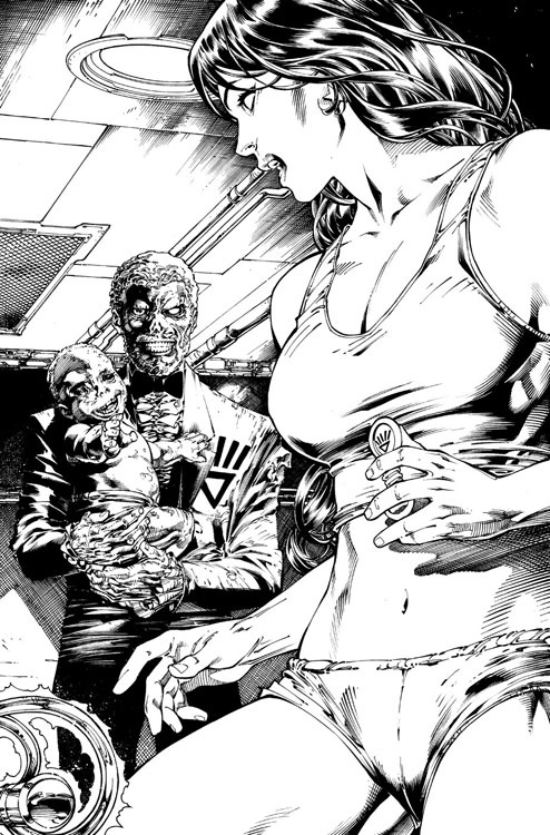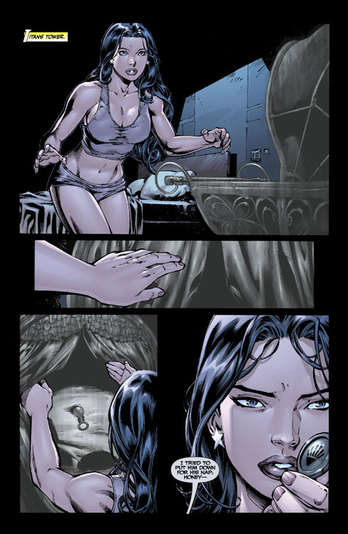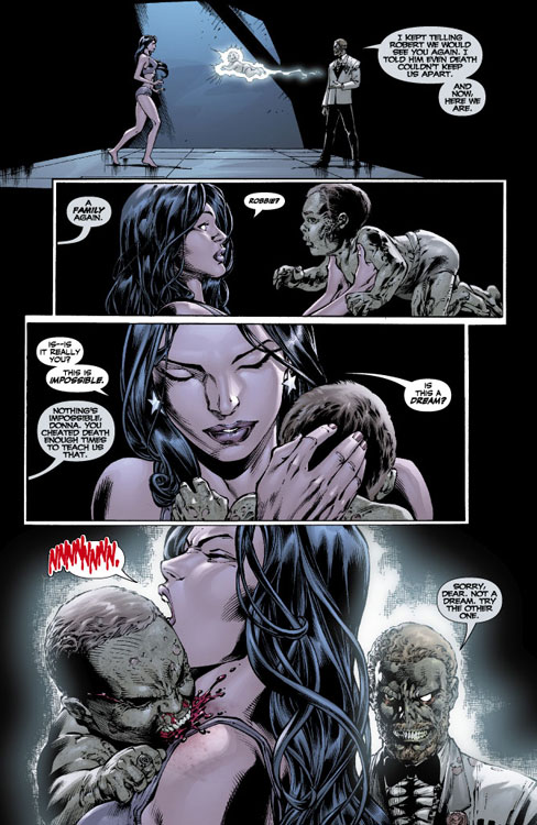 Meanwhile, as Dawn Granger's worst nightmares are realized, Donna Troy believes her dreams are finally becoming true. Her child, though rotten and oozing with puss, floats into her arms at last. Her late husband Terry looks on, an evil grin upon his face. But little Robbie is hungry. And he hungers for flesh.