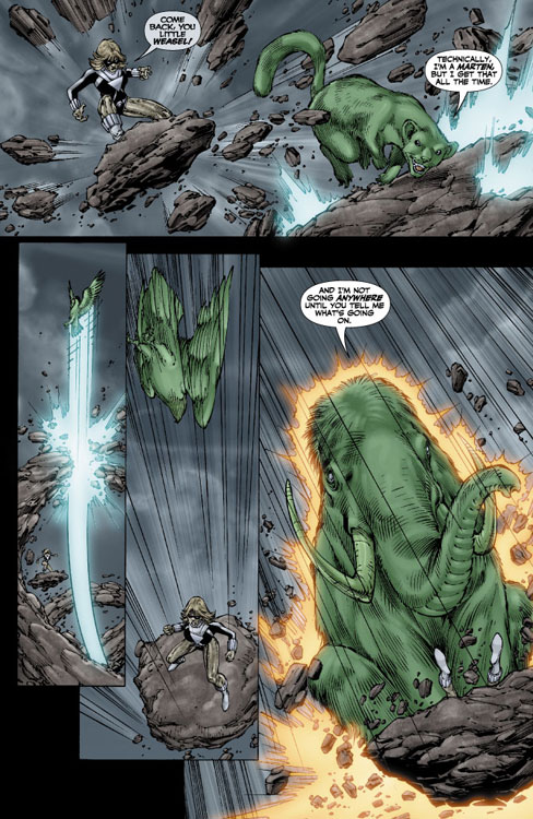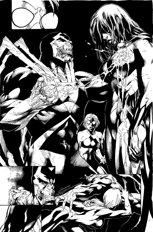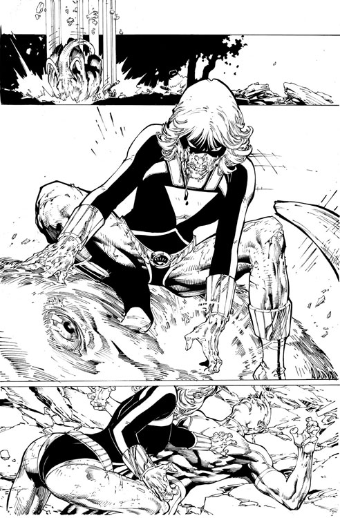 As he stands there holding her sister's heart in his hands, savoring the remaining rage dripping from her soul, Black Lantern Hank Hall tries his best to evoke some kind of emotion from Dawn Granger. Yet despite watching her own beloved sister slain before her very eyes, Dawn remains at peace. And peace is not an emotion which Black Lanterns can identify. But what happens when the blackness seeps into Holly's heart and she becomes a Black Lantern as well? Dawn tries her best to keep at peace but is eventually forced to flee with the two Black Lantern Hawks following close behind.