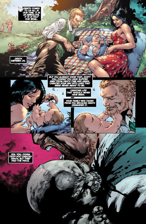 Yet as they stand to re-enter the battle, their new weapon in Dove by their side, Donna Troy knows that she has death creeping within her now. The blackness courses through her veins.