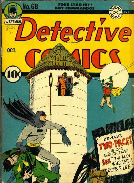 Two-Face escapes from Batman and begins crimes involving doubles and the number two. He tries briefly to reconcile with his fiancee Gilda, but when the make-up he uses to disguise his disfigurement melts, his mind snaps. Two-Face then ruins the make-up artist who disguised him. The artist’s son joins the crook’s gang in order to double-cross Two-Face. Batman arrives in time to save the boy’s life and turn the crook into the police.