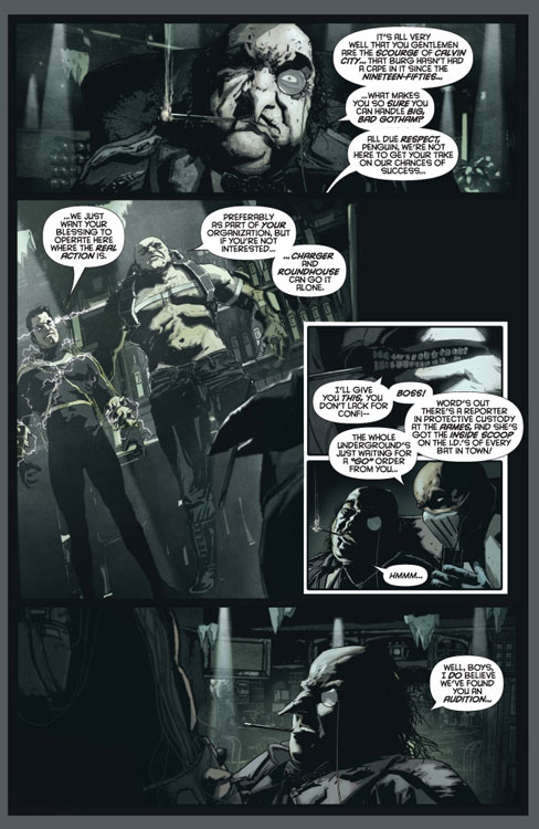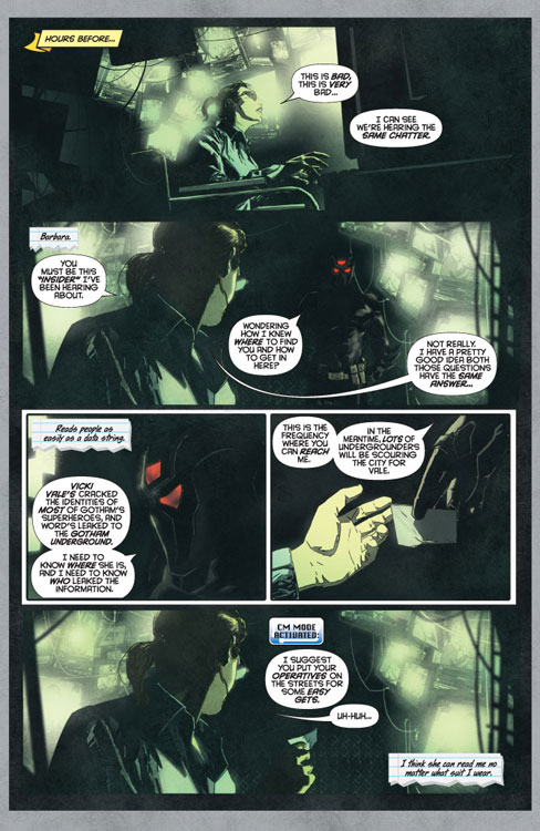 CHARACTERS: Insider (Bruce Wayne); Commissioner James Gordon; Oracle (Barbara Gordon); Penguin (Oswald Cobblepot)