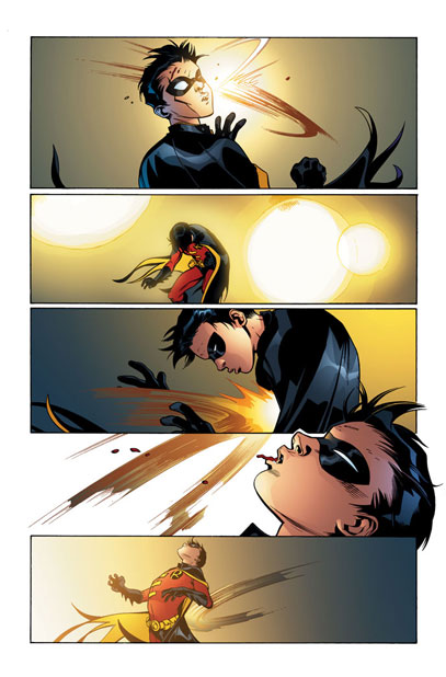 Robin was attacked. Floodlights temporarily blinded him, so he threw Rs at where the attackers legs should have been. When he got his vision back, Batgirl was laying dead with his darts in her neck. He found the victim to be Lynx (not Cassie), and she'd been dead for at least three hours. The police found him at the scene, but he escaped. One commented "First Nightwing, now you?"
