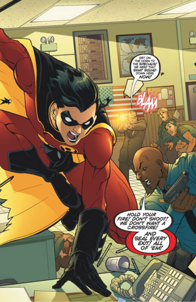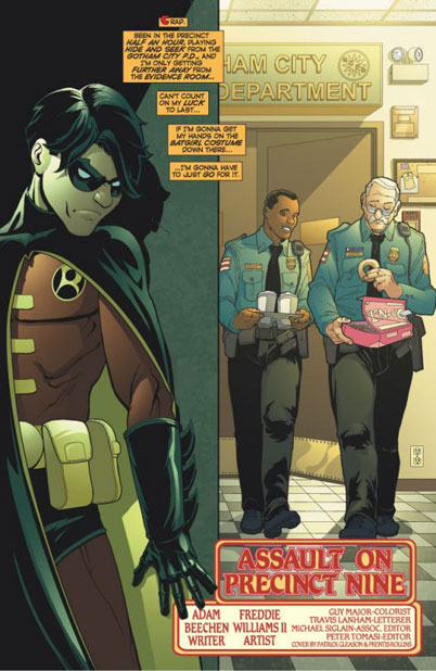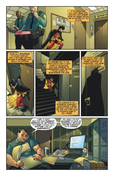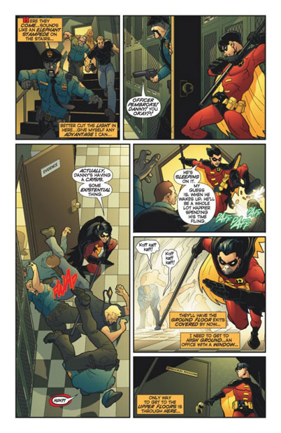 Robin made his way toward the evidence room. He got to the fake costume and was spotted. A shot was fired and the entire force was in pursuit. He escaped by putting on a cop uniform.