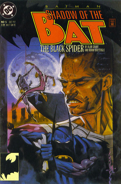 As Batman reads the letter, the story backtracks to a drug deal being broken up by the Black Spider. He makes short work of the participants and demands that the dealer tell him the name of their supplier, shoving the man's face in heroin. Soon after the confession, Batman shows up and demands Black Spider to stop. They begin battling and debate the differences and similarities of their vigilance. Black Spider quickly escapes atop a train before the story changes focus to the previously seen deceased woman, Linda Morrel.