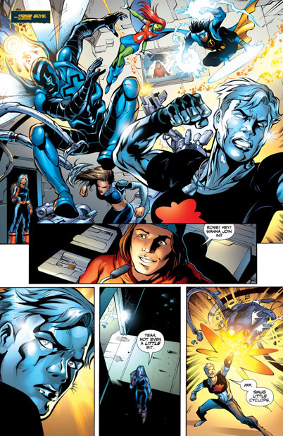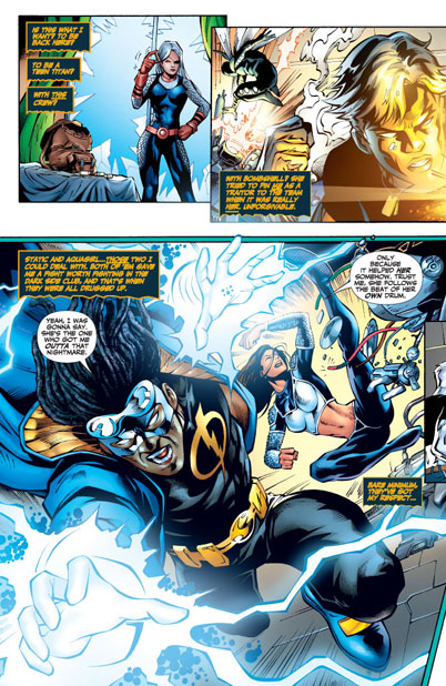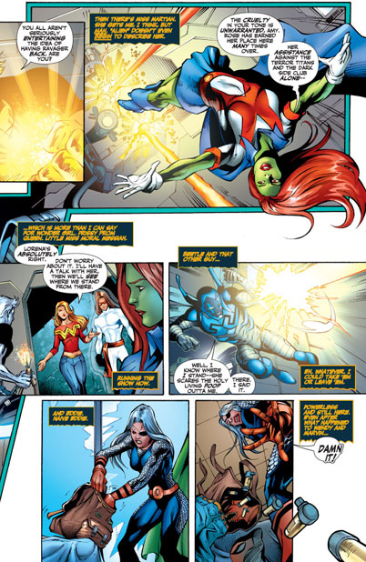 CHARACTERS: Wonder Girl (Cassie Sandsmark); Ravager (Rose Wilson); Blue Beetle (Jamie Reyes); Kid Eternity; Miss Martian; Red Devil (Eddie Bloomberg); Static (Virgil Hawkins); Aquagirl (Lorena Marquez); Bombshell (Amy Sue Allen)