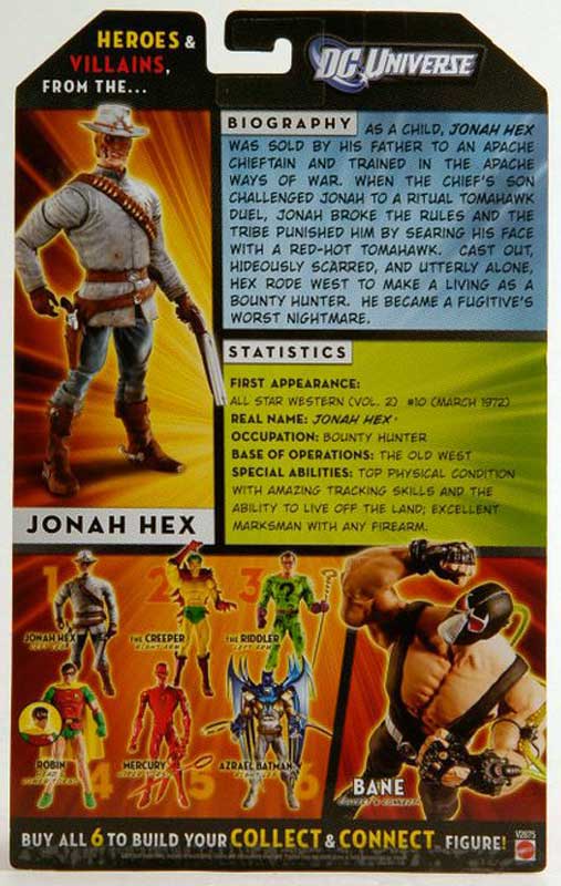 As a Child, Jonah Hex was sold by his father to an Apache Chieftain and trained in the Apache ways of war. When the cheif's son challenged Jonah to a ritual tomahawk duel, Jonah broke the rules and the tribe punished him by searing his face with a red-hot tomahawk. Cast out, hideously scarred, and utterly alone, Hex rode west to make a living as a bounty hunter. He became a fugitive's worst nightmare.