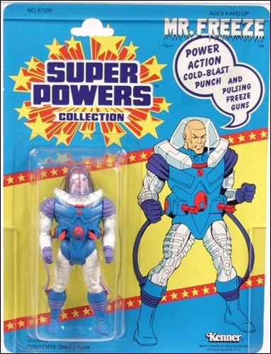 Features punching arms and pulsating "freeze guns" at the waist activated by squeezing the legs together. Transparent plastic head dome is removable. The sculpt was later used for a Toy Biz Mister Freeze figure.