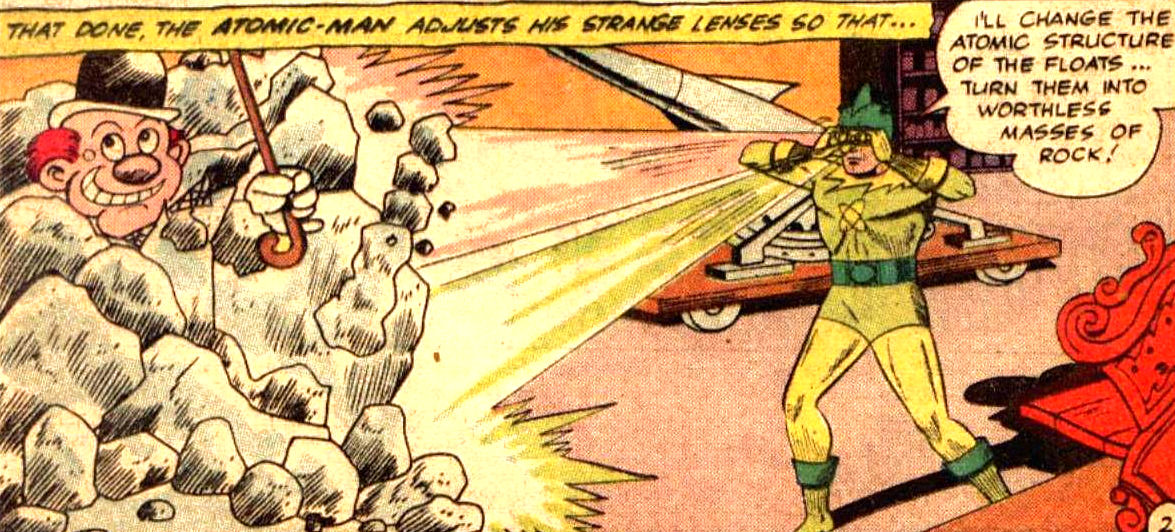 After his release from prison, criminal Paul Strobe plotted revenge against his former business partners: Hayes, Jenkins, and Barker. Strobe invented atomic goggles which give him extraordinary abilities, he then begun his revenge scheme. Batman interfered, but Atomic Man escaped.  When the crook strikes again, he uses his goggles to make Batman's cowl transparent, but the Caped Crusader anticipated the move and covered his face with make-up to protect his identity. Finally, Batman defeated Strobe and his gang and brought them to justice.