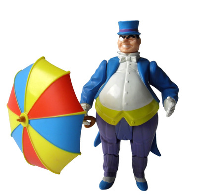 Includes a Super Powers Collection mini comic and umbrella accessory. Umbrella features a spinning top and a retractable rod. Features a swinging arm activated by squeezing the legs together. Coat tails are removable. The sculpt was reused later for other Penguin figures from Toy Biz and Kenner.