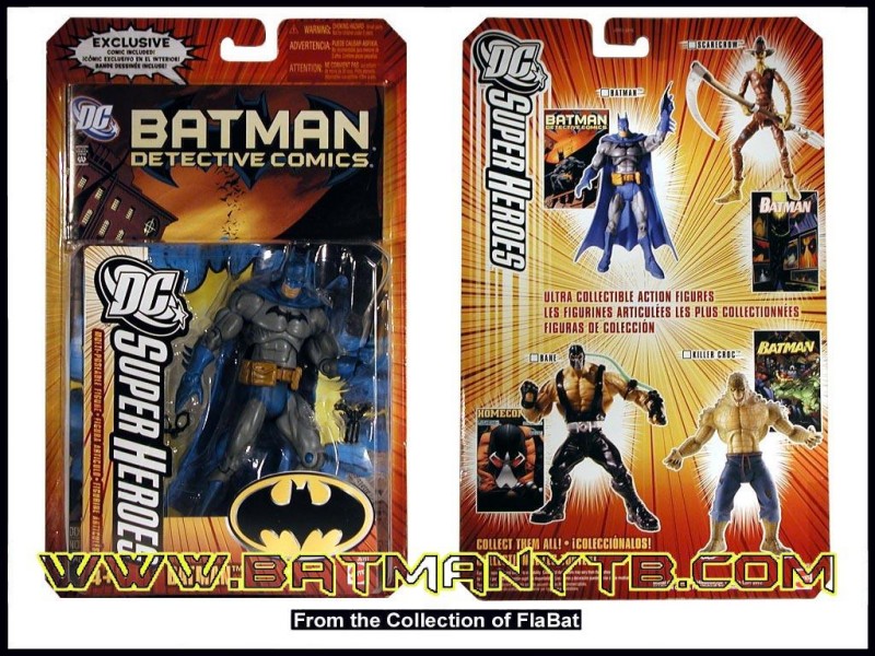 The comic style Batman is back. Just before Christmas the new DC SuperHeroes line of figures hit the pegs. The first four figures, Batman, Bane, Killer Croc and Scarecrow are re-releases from last wave of Comic Style figures that Mattel released overseas. These figures are similar, but have some new features and are not identical to those. This figure is based on Batsignal Batman one of the Deluxe Figures from Wave 6. The only exceptions are that it was been repainted to blue/gray and does not have the ball jointed head or the cloth cape and there is no Batsignal included with the figure.