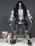 Biography: Lobo is a Bounty Hunter and contract killer wanted across the universe. [Lobo] His real name is unpronounceable, and he has no set base of operations, preferring to remain mobile. Lobo has immense superhuman strength, is virtually invulnerable, has increased agility, speed and stamina, and is able to recover from almost any wound or injury. Lobo is the best tracker in the universe, and wields a huge variety of guns and weapons, including his favorite: a long, heavy chain with a sharp hook on the end.