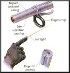 Powered by a rechargeable micro fuel cell, the Fingerlight can be worn on any digit. White, red, and infrared radial LEDs provide focused or wide angle collimated 10,000 micro candela beams via touch sensitive fingertip controls.