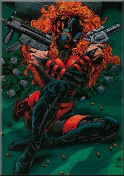 Kate Riordan was the latest member of a highly sucessful and respected police dynasty in Bludhaven. When she and her relatives were gathered together for a photo shoot, the underworld saw this as a wonderful moment to strike, killing them all in a huge explosion. All except Kate, who was thrown free and horribly disigured. Enraged, she recently returned to the 'haven to exact revenge on those who were involved with the photo shoot, killing quite a number of them.