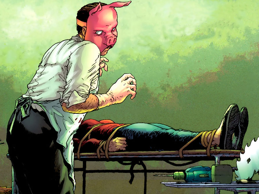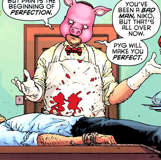 A small-time "extreme" circus leader and head of the Le Cirque D'Etrange, Pyg crafted a unique form of narcotic which can be spread in the form of a virus and is capable of erasing someone's personality and mind. When he first crosses paths with the Batman he is selling the identity-destroying drug to Russian people traffickers for use in their illegal immigration and prostitution fronts.