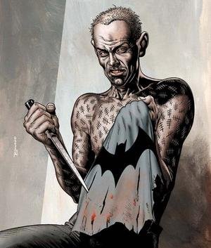A naked, desperate and totally deranged Zsasz appeared in the first issue of Batman: Cacophony (2008), written by film director Kevin Smith, killing a young couple and threatening their children before Batman subdues him. His thoughts move so quickly that there are no spaces between the words. In the issue, Batman says that of all the criminals he fights, he hates Zsasz the most.