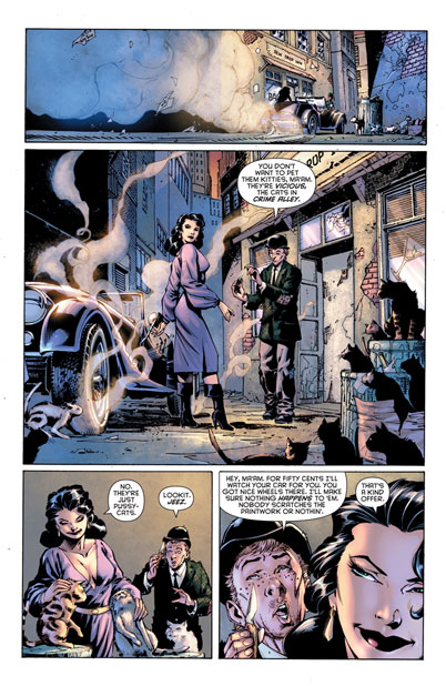 Kyle, or Sadie Kelowski as she used to be known in the days before Pearl Harbor, tells her story, "The Cat-Woman's Tale." In her interpretation of events she first met Batman during her early days as the masked burglar "The Cat." The two would engage in a tumultuous
