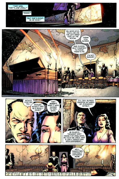 After being greeted by the Inn's bartender Joe Chill, mourners are then directed to the main room where Alfred seats them - heroes on the right, villains on the left. They gather around the casket and help themselves to pie and sandwiches and