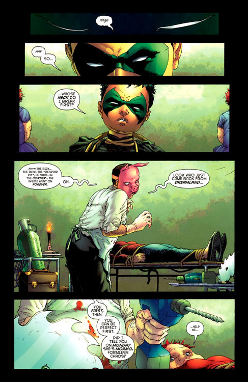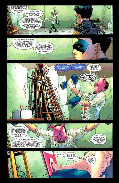 Miles away at the run-down amusement park, Damian Wayne is regaining consciousness and finding himself in the company of the one and only Professor Pyg. Wearing a pink pig mask over his face, the portly and sweaty mess of an "artist" begins to display just how far he's gone off his medication. Lazlo, a one-time leader of an extreme circus troupe, puts on a true artist's performance for the young lad revealing little pieces of his shattered psyche in the process.