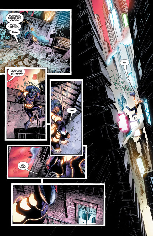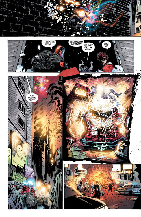 Finally catching up to the neophyte vigilantes, Dick and Damian arrive just in time before the Hood can pull the triggers. And